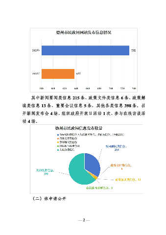 其中新闻要闻类信息 215 条、政策文件类信息 6 条、政策解 读类信息 13 条、重要会议信息 5 条,其他各类信息 398 条。召 开新闻发布会 4 场、组织政府开放日活动 1 次、参与在线访谈活 动 4 场。 (二)依申请公开 — 2 —