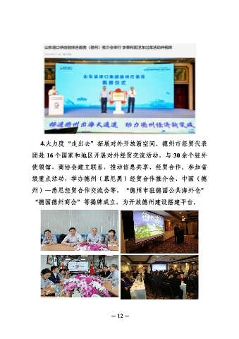 4.大力度“走出去”拓展对外开放新空间。德州市经贸代表 团赴 16 个国家和地区开展对外经贸交流活动,与 30 余个驻外 使领馆、商协会建立联系,推动信息共享、经贸合作。参加省 级重点活动,举办德州(慕尼黑)经贸合作推介会、中国(德 州)—悉尼经贸合作交流会等,“德州市驻德国公共海外仓” “德国德州商会”等揭牌成立,为开放德州建设搭建平台。 — 12 —
