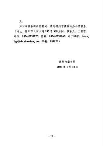 无。 如对本报告有任何疑问,请与德州市商务局办公室联系。 (地址:德州市长河大道 187 号 308 房间,联系人:王明哲, 电话:0534-2231976,传真:0534-2231966,电子邮箱:dzsswj bgs@dz.shandong.cn,邮编:253076) 德州市商务局 2025 年 1 月 13 日 — 17 —