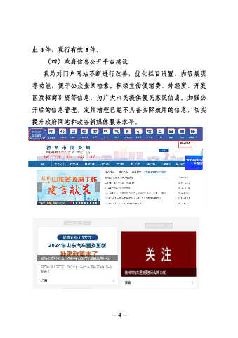 止 0 件,现行有效 5 件。 (四)政府信息公开平台建设 我局对门户网站不断进行改善,优化栏目设置、内容展现 等功能,便于公众查阅检索。积极宣传促消费、外经贸、开发 区及招商引资等信息,为广大市民提供便民惠民信息。加强公 开后的信息管理,定期清理已经不具备实际效用的信息,切实 提升政府网站和政务新媒体服务水平。 — 4 —