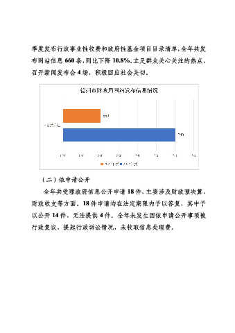 季度发布行政事业性收费和政府性基金项目目录清单,全年共发 布网站信息 660 条,同比下降 10.8%。立足群众关心关注的热点, 召开新闻发布会 4 场,积极回应社会关切。 (二)依申请公开 全年共受理政府信息公开申请 18 件,主要涉及财政预决算、 财政收支等方面。18 件申请均在法定期限内予以答复,其中予 以公开 14 件、无法提供 4 件。全年未发生因依申请公开事项被 行政复议、提起行政诉讼情况,未收取信息处理费。