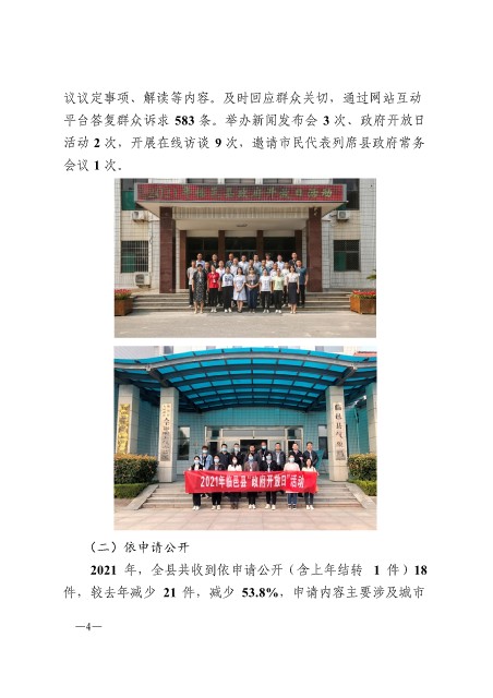 议议定事项、解读等内容。及时回应群众关切,通过网站互动 平台答复群众诉求 583 条。举办新闻发布会 3 次、政府开放日 活动 2 次,开展在线访谈 9 次,邀请市民代表列席县政府常务 会议 1 次。 (二)依申请公开 2021 年,全县共收到依申请公开(含上年结转 1 件)18 件,较去年减少 21 件,减少 53.8%,申请内容主要涉及城市 —4—
