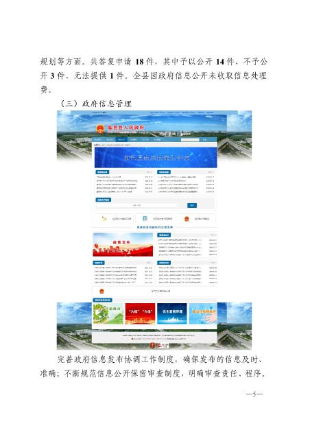 规划等方面。共答复申请 18 件,其中予以公开 14 件、不予公 开 3 件、无法提供 1 件。全县因政府信息公开未收取信息处理 费。 (三)政府信息管理 完善政府信息发布协调工作制度,确保发布的信息及时、 准确;不断规范信息公开保密审查制度,明确审查责任、程序。 —5—