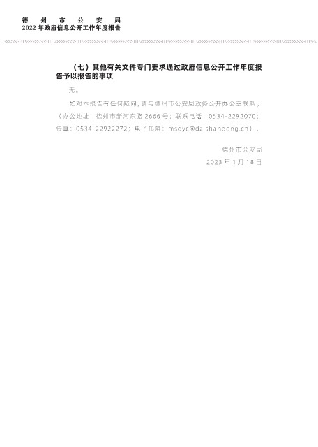 德 州 市 公 安 局 2022 年政府信息公开工作年度报告 (七)其他有关文件专门要求通过政府信息公开工作年度报 告予以报告的事项 无。 如对本报告有任何疑问,请与德州市公安局政务公开办公室联系。 (办公地址:德州市新河东路 2666 号;联系电话:0534-2292070; 传真:0534-22922272;电子邮箱:msdyc@dz.shandong.cn)。 德州市公安局 2023年1月18日