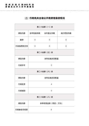德州市统计局 2022 年政 府信息公开工作年度报告 二 行政机关主动公开政府信息的情况 第二十条第(一)项 信息内容 本年制发件数 本年废止件数 现行有效件数 规章 0 0 0 行政规范性文件 0 0 0 第二十条第(五)项 信息内容 本年处理决定数量 行政许可 0 第二十条第(六)项 信息内容 本年处理决定数量 行政处罚 4 行政强制 0 第二十条第(八)项 信息内容 本年收费金额(单位:万元) 行政事业性收费 0
