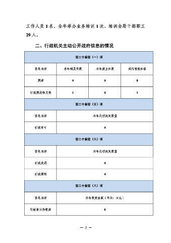 工作人员 1 名。全年举办业务培训 1 次,培训全局干部职工 29 人。 二、行政机关主动公开政府信息的情况 第二十条第(一)项 信息内容 本年制发件数 本年废止件数 现行有效件数 规章 0 0 0 行政规范性文件 1 0 1 第二十条第(五)项 信息内容 本年处理决定数量 行政许可 0 第二十条第(六)项 信息内容 本年处理决定数量 行政处罚 0 行政强制 0 第二十条第(八)项 信息内容 本年收费金额(单位:万元) 行政事业性收费 0 — 5 —