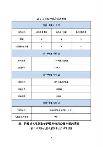 表 1 主动公开政府信息情况 第二十条第(一)项 信息内容 本年制发件数 本年废止件数 现行有效件数 规章 0 0 0 行政规范性文件 0 0 0 第二十条第(五)项 信息内容 本年处理决定数量 行政许可 230877 第二十条第(六)项 信息内容 本年处理决定数量 行政处罚 867265 行政强制 10015 第二十条第(八)项 信息内容 本年收费金额(单位:万元) 行政事业性收费 170.94 三、行政机关收到和处理政府信息公开申请的情况 表 2 收到和处理政府信息公开申请情况 5