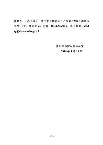科联系。(办公地址:德州市天衢新区三八东路 1288 号鑫星国 际 2511 室;联系电话、传真:0534-2269052;电子邮箱:dzrf ry@dz.shandong.cn) 德州市国防动员办公室 2024 年 1 月 19 日 - 9 -
