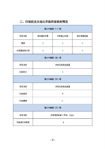 二、行政机关主动公开政府信息的情况 第二十条第(一)项 信息内容 本年制发件数 本年废止件数 现行有效件数 规章 0 0 0 行政规范性文件 0 0 0 第二十条第(五)项 信息内容 本年处理决定数量 行政许可 0 第二十条第(六)项 信息内容 本年处理决定数量 行政处罚 0 行政强制 0 第二十条第(八)项 信息内容 本年收费金额(单位:万元) 行政事业性收费 0 - 5 -