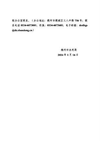 组办公室联系。(办公地址:德州市德城区三八中路 756 号;联 系电话 0534-6073001,传真:0534-6073681;电子邮箱:dzslbgs @dz.shandong.cn) 德州市水利局 2024 年 1 月 16 日