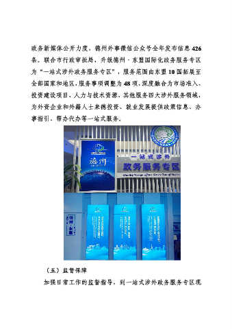 政务新媒体公开力度,德州外事微信公众号全年发布信息 426 条。联合市行政审批局,升级德州·东盟国际化政务服务专区 为“一站式涉外政务服务专区”,服务范围由东盟 10 国拓展至 全部国家和地区,服务事项调整为 48 项,深度融合为市场准入、 投资建设项目、人力与技术资源、其他服务四大涉外服务领域, 为外资企业和外籍人士来德投资、就业发展提供政策信息、办 事指引、帮办代办等一站式服务。 (五)监督保障 加强日常工作的监督指导,到一站式涉外政务服务专区现